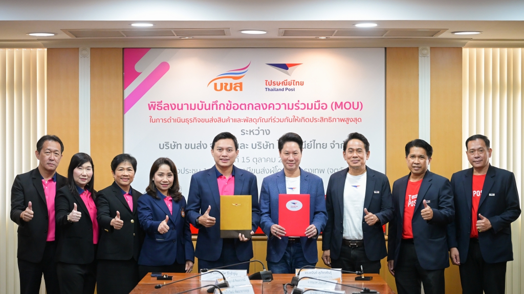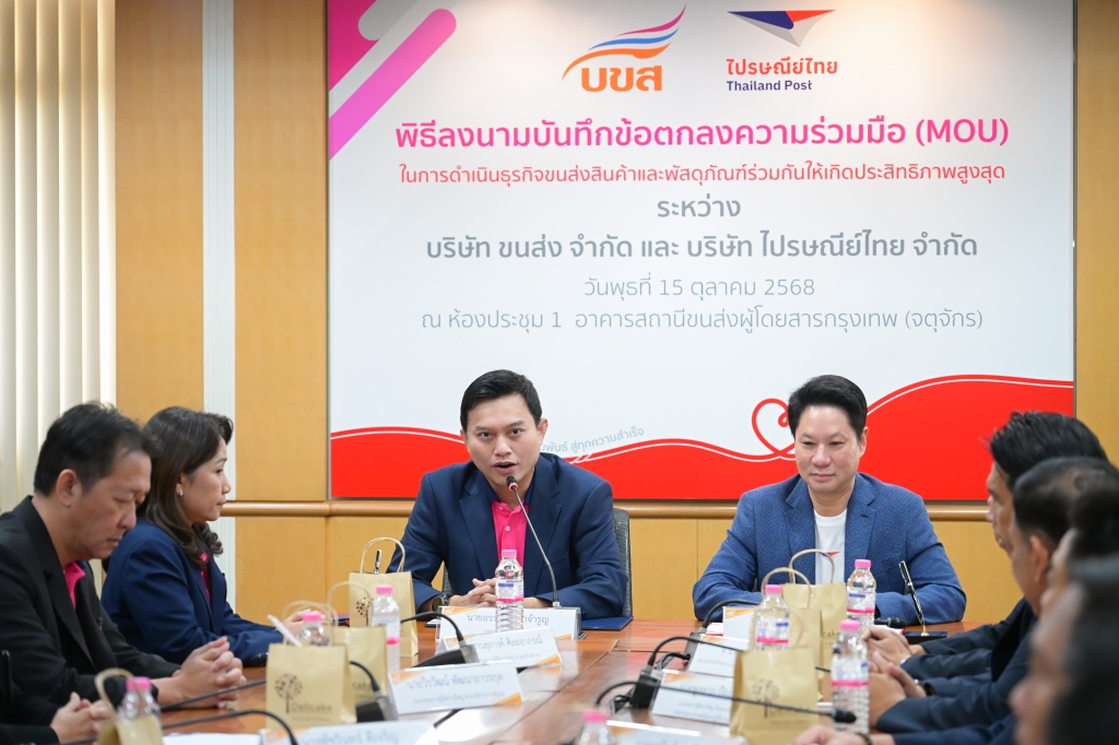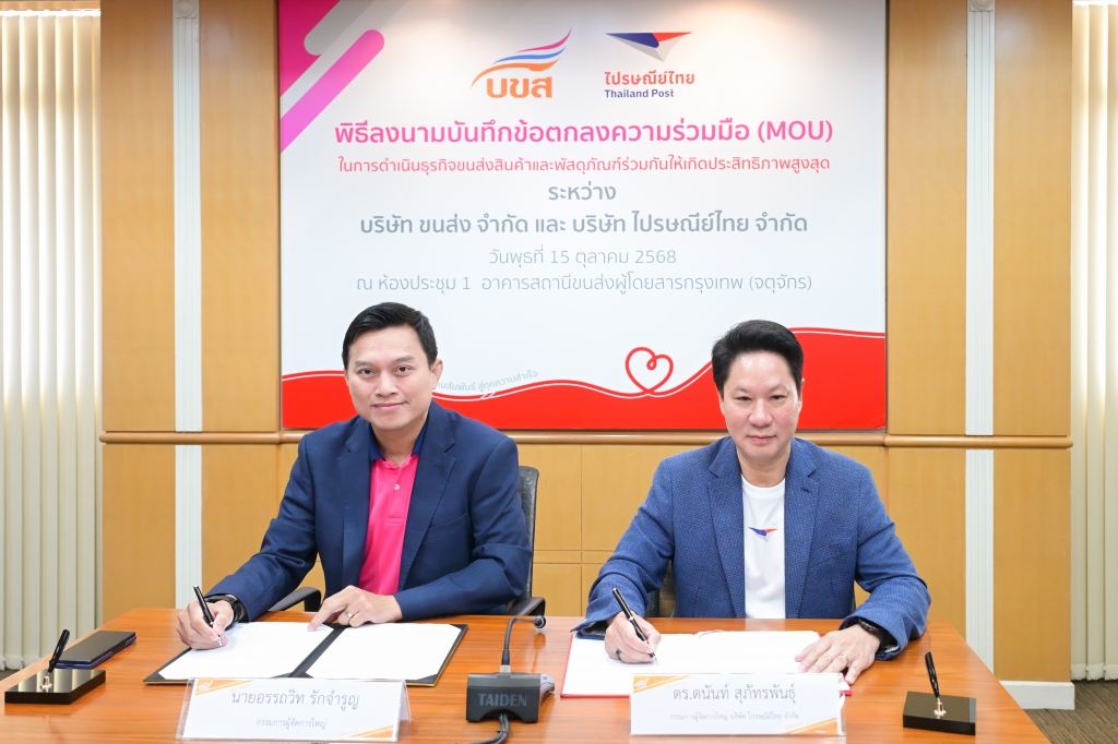 กรุงเทพฯ 15 ตุลาคม 2568 — บริษัท ไปรษณีย์ไทย จำกัด ผนึกความร่วมมือ บริษัท ขนส่ง จำกัด หรือ บขส. เสริมความแข็งแกร่งระบบโลจิสติกส์ภาครัฐ บูรณาการเครือข่ายและศักยภาพของทั้งสององค์กรให้บริการนำจ่ายสิ่งของถึงผู้รับปลายทางในประเทศแบบ Hub to Door พร้อมเปิดจุดให้บริการเพื่อนพี่ไปรฯ EMS Point รับฝากสิ่งของส่งทางไปรษณีย์ ขานรับนโยบายเร่งด่วน (Quick Big Win) ของรัฐบาลในการลดต้นทุนโลจิสติกส์ สนับสนุนภาคเกษตรกรรม ผู้ประกอบการ SMEs และ กระตุ้นเศรษฐกิจอย่างยั่งยืน