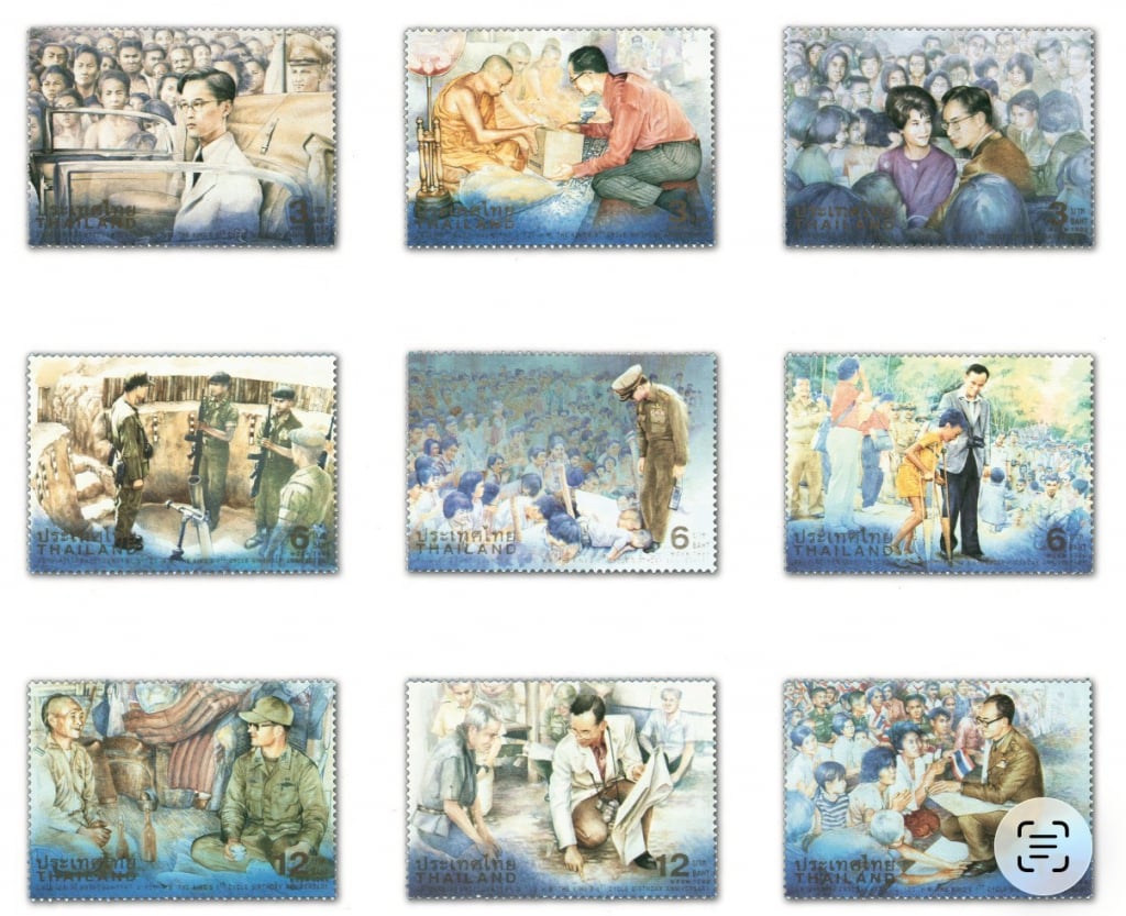 - คู่พระบารมี พระจักรีภูมิพล ภาพในวัยเยาว์ที่ทรงเคียงข้างพระบาทสมเด็จพระมหาภูมิพลอดุลยเดชมหาราช บรมนาถบพิตร รัชกาลที่ 9 ปรากฏอยู่บนแสตมป์หลายชุดในฐานะ “คู่พระบารมี” ที่ทรงร่วมกันทรงงานเพื่อชาติและประชาชน พระราชดำรัสที่เปี่ยมด้วยความหมาย “พระเจ้าอยู่หัวทรงเป็นน้ำ ฉันจะเป็นป่า” สะท้อนพระราชปณิธานอันลึกซึ้งแห่งการอยู่คู่กันอย่างเกื้อกูล แสตมป์ที่ถ่ายทอดพระราชกรณียกิจด้านสิ่งแวดล้อม ป่าไม้ และการอนุรักษ์ทรัพยากรธรรมชาติ จึงเป็นพยานแห่งความรักต่อผืนแผ่นดินและหัวใจที่ทรงอุทิศเพื่อความร่มเย็นของประเทศไทย