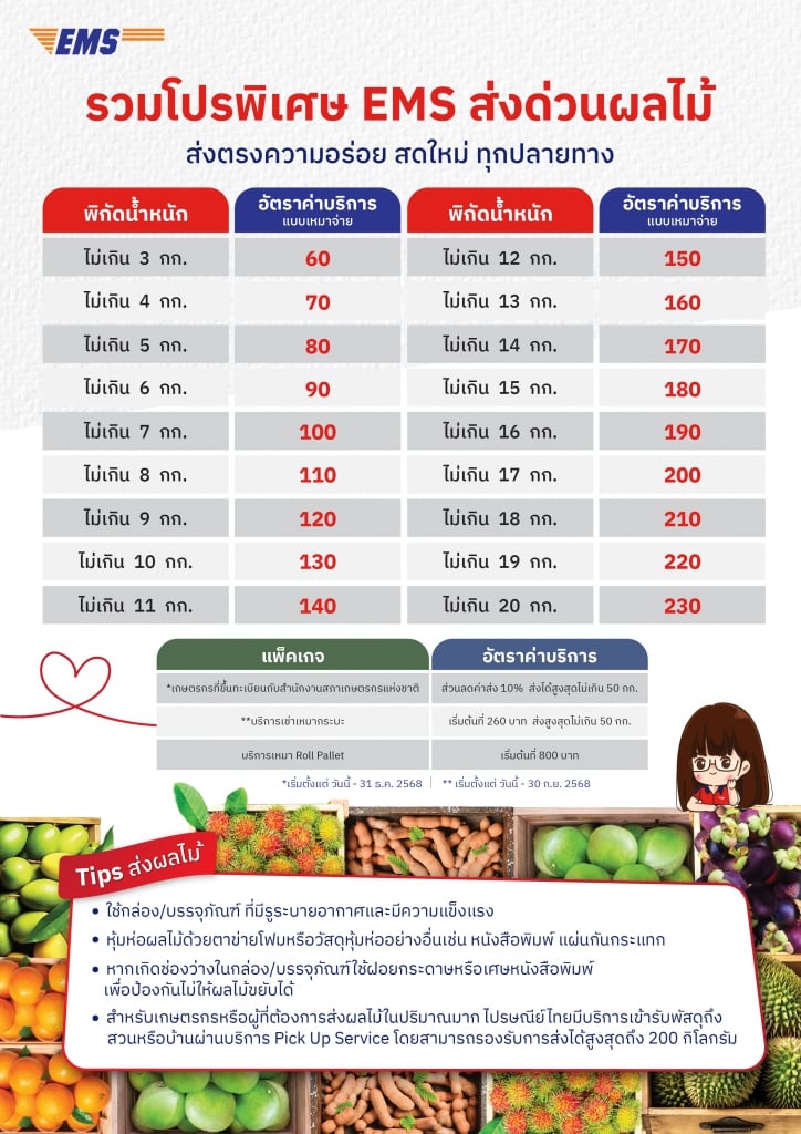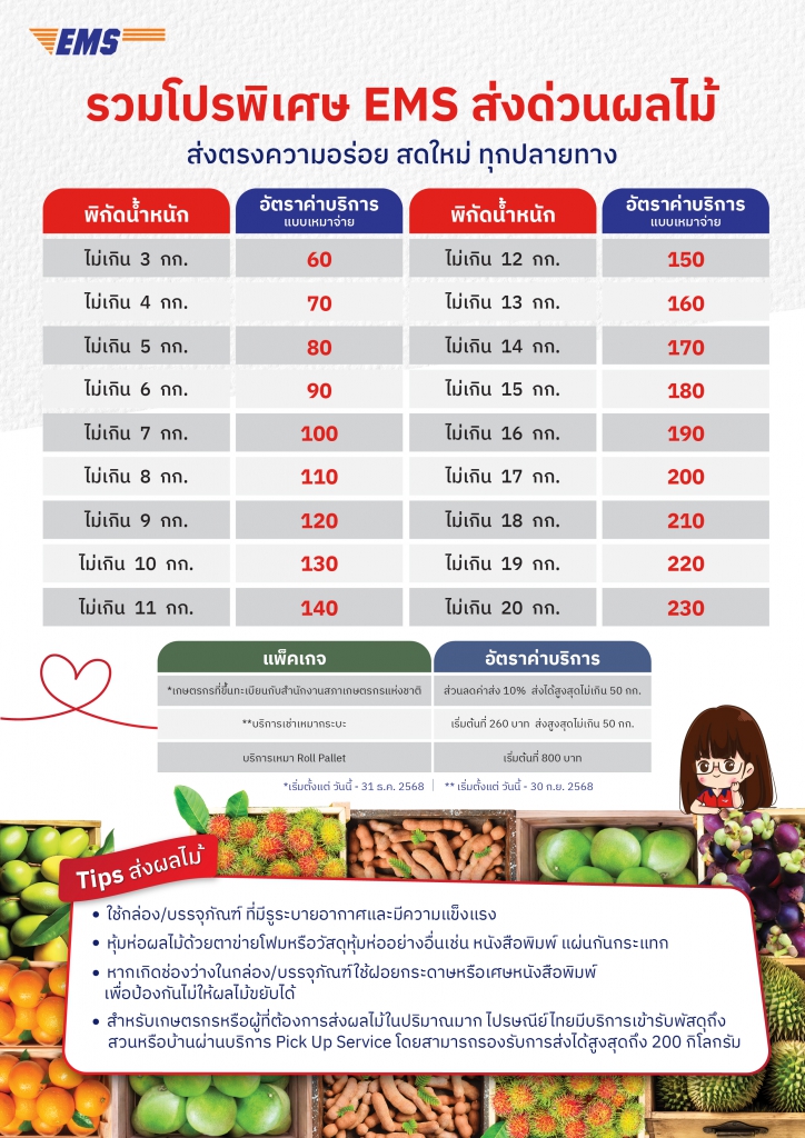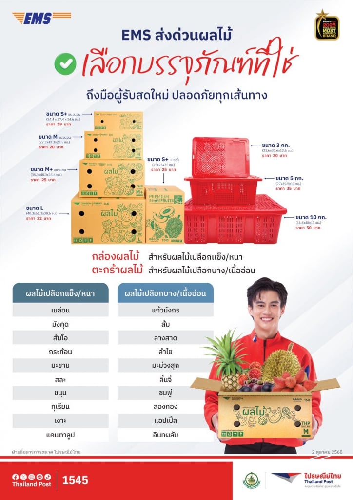 ใช้กล่อง/ตะกร้าผลไม้ไปรษณีย์ไทย มีให้เลือกหลากหลายขนาด สามารถหาซื้อหรือสอบถามรายละเอียดเพิ่มเติมได้ที่ ปณ. ใกล้บ้าน